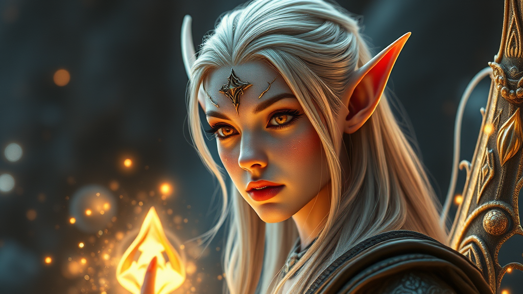 Design an elf character with extraordinary magical abilities, portrayed in full body with a focus on cinematic lighting, set in an epic fantasy realm. The character should be hyper-realistic, showcasing intricate details in 8k resolution with an aspect ratio of 9:16. Introduce subtle creative elements that enhance the mystical aura and elegance of the elf, while preserving the essence of a magical, hyper-detailed fantasy world.
