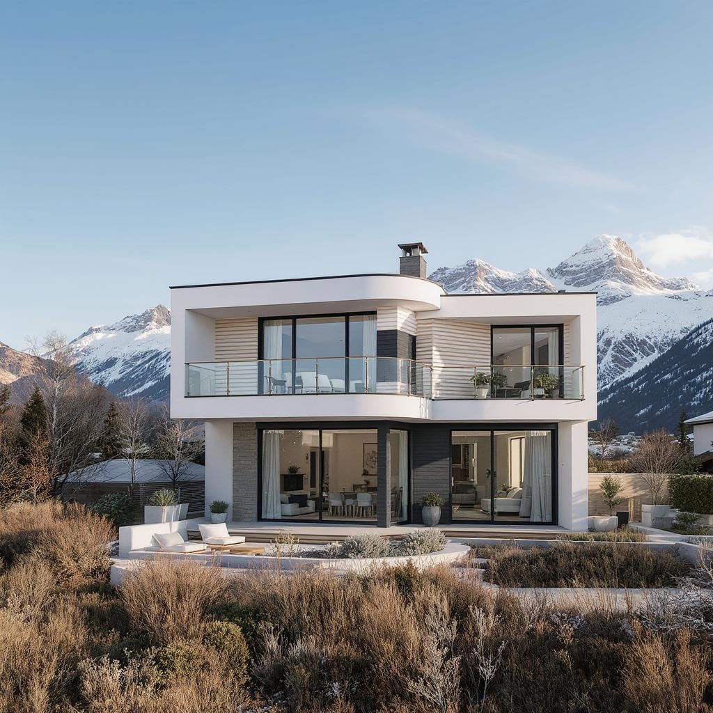 Design and create an image of a modern 130-square-meter, two-bedroom villa with exceptional ventilation and a 100-square-meter first floor offering an eastern view overlooking snow-capped mountains with excellent natural lighting.