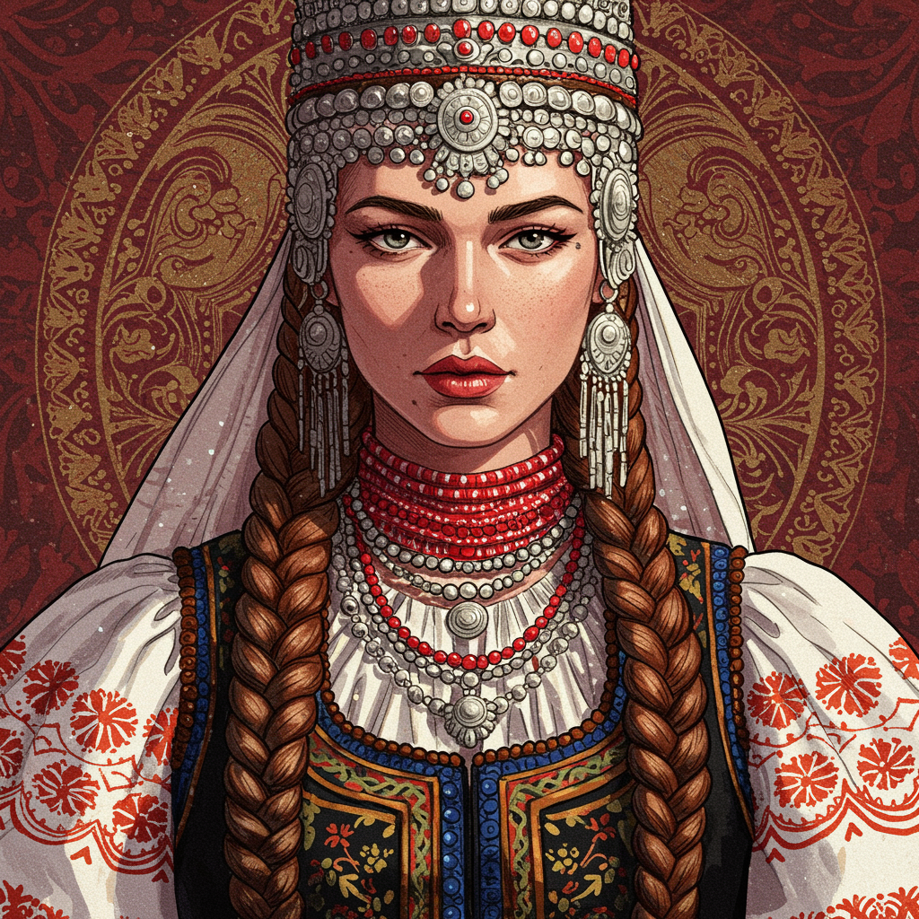 Detailed and captivating illustration, a woman gazing directly at the viewer, adorned in a traditional folk costume, intricate patterns, vibrant colors, shimmering textures, and subtle hints of cultural symbolism integrated into her attire and surroundings, her expression confident and enigmatic, with a dynamic play of light and shadow enhancing the realism and depth of the scene.