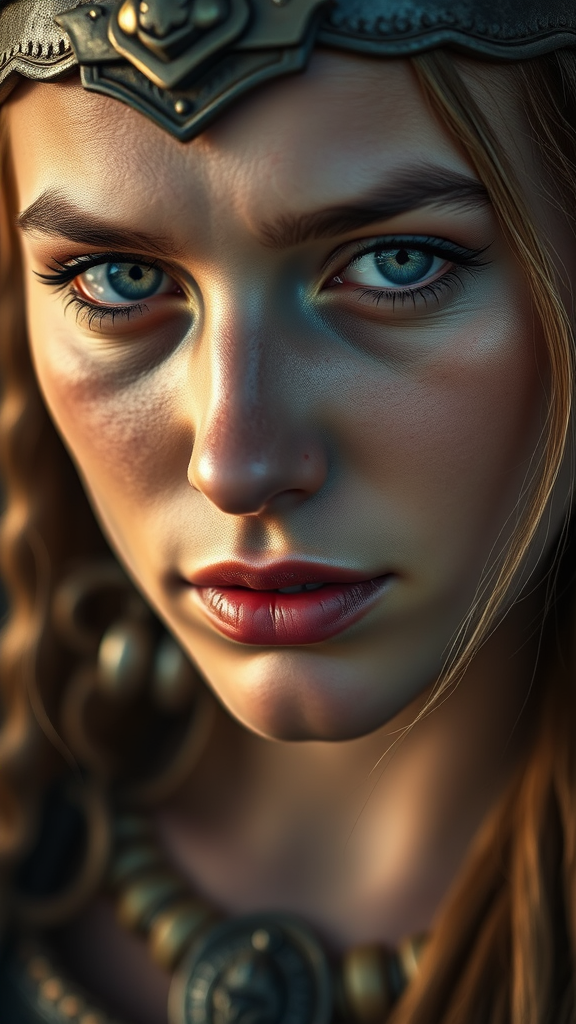 Detailed and realistic portrait of a stunning contemporary female Viking, featuring soft natural lighting in portrait photography style with an 85mm lens. The image captures a sense of magical photography, emphasizing dramatic lighting and photo realism. It showcases an ultra-detailed, intimate portrait composition reminiscent of Cinestill 800T. The photograph highlights distinctiveness and beauty without text errors, ensuring proper anatomy and proportions. The portrait is well-cropped, free from jpeg artifacts or any distortions like extra limbs or disfigurements. It's a flawless, high-quality representation focused on authenticity and elegance, avoiding any imperfections or amateurish elements such as watermarks or blurriness.