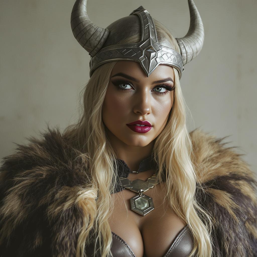 Detailed and realistic portrait of a stunning modern female Viking, captured with soft natural lighting and dramatic shadows, simulating an 85mm lens feel. The image conveys a sense of magical photography, achieving photo realism with ultra-detailed features and an intimate portrait composition. Emulating the look of Cinestill 800T film, the portrait is rich with color and clarity. The Viking's visage radiates strength and beauty, framed by an enchanting aura. Her outfit combines traditional Viking elements with a modern twist, enhancing the portrait's intriguing blend of history and modernity. The background remains understated, ensuring the focus remains solely on her captivating presence.