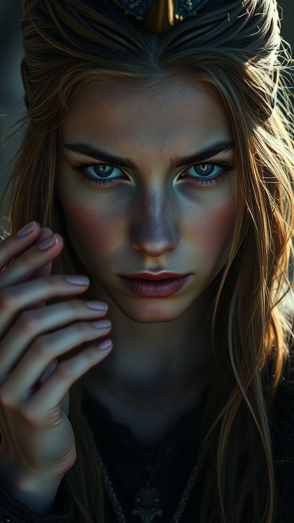 Detailed and realistic portrait of an enchanting contemporary female Viking | gentle natural lighting | portrait photography | 85mm lens | mystical photography | striking lighting | photo realism | highly detailed | intimate portrait composition | film photography grain | textural nuances | artistic aberrations | digital noise | artistry imperfections | creative angles | unique perspective | subtle artifacting | symbolic signature elements | anatomical anomalies | abstract hands | out-of-frame intrigue | artistic blurring | soft focus | distorted beauty | unconventional charm | ethereal imperfections | imaginative watermark elements.