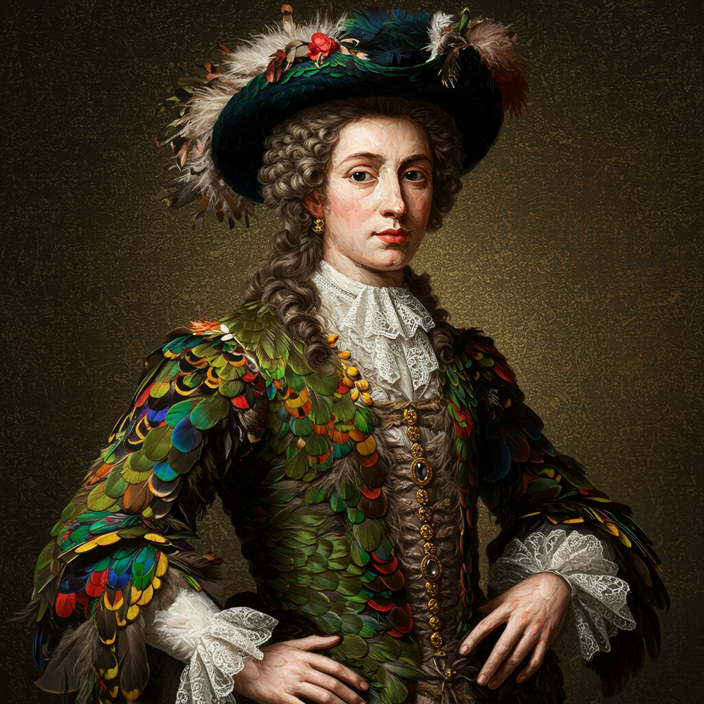 A richly detailed baroque portrait of a person composed entirely of vibrant, textured feathers, showcasing intricate craftsmanship and hyper-realistic detail. The artwork exudes a sense of elegance and grandeur, reminiscent of Tom Bagshaw's style, highlighting the subject's majestic pose and elaborate attire. The composition is captivating and dynamic, set against a beautifully textured backdrop that enhances the intricate play of colors and feather patterns. The piece is a testament to the artist's skill, producing a visually compelling and uniquely imaginative masterpiece.