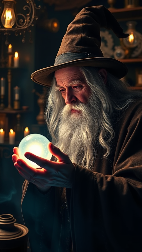 Detailed cinematic scene featuring an old wizard with flowing white hair and a long beard, dressed in a traditional wizard's robe and tall hat. He is deep in thought, gazing intently at a glowing orb held in his hands. The atmosphere is set in a dimly lit room, illuminated by flickering and mystical lights that cast intricate shadows across the space filled with magical artifacts. The focus is sharp on his contemplative expression, capturing the wisdom and mystery of his character. The image is ultra-high definition with attention to detail, ensuring a clean and captivating visual experience with no distortions or anomalies. The setting is rich with the ambiance of a magician's sanctum, enhancing the mystical and enchanting quality of the scene.