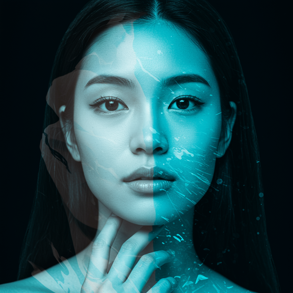 A highly detailed and multi-layered collage of a woman's face, inspired by the fluid and expressive style of Josef Kote, blended with the contemporary grunge beauty found in Dain Yoon's work. The composition explores vibrant cyan and blue hues, creating a textured and realistic portrayal that hints at the intricate brushwork of Antonio Mancini. The visual layers intertwine seamlessly, capturing depth and movement within a vertical 73:111 aspect ratio, emphasizing stylized beauty and abstract realism.