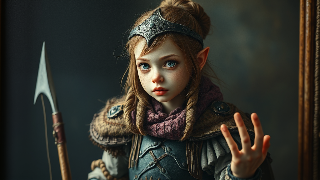 Detailed concept art illustration, dark soft focus, oil painting on canvas of a young Viking warrior girl in full intricate clothing, biomutant, dystopian, micro detail, octane render, 4K, blurry, abstract, cartoon-like with a toy figure quality, framed, 3D elements, bizarre proportions, unusual colors, slight blur haze, elongated features, expressive design, draft-like appearance, uniquely shaped hands, imaginative form, mutation-inspired elements, slightly out of focus, intriguing anatomy, whimsical touch, disjointed limbs, otherworldly, peculiar proportions.