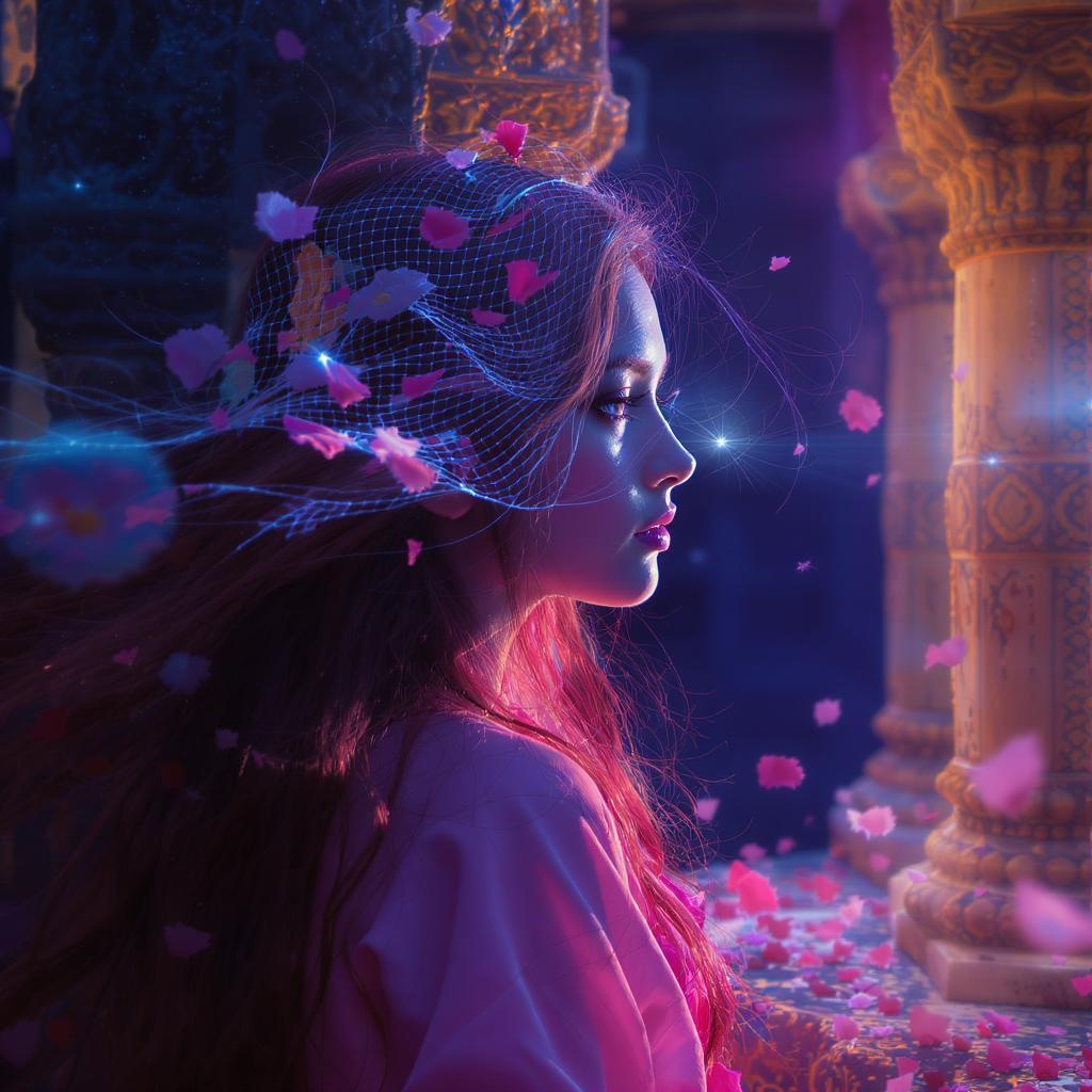 a stunningly detailed depiction of a vibrant scene featuring a single girl in sharp focus, surrounded by an intricate and richly textured background. This masterpiece showcases vivid 8k resolution and HDR effects, with a play of broad light and high contrast. The image uses backlighting to highlight its subject, creating an ethereal glow with subtle bloom and light sparkles. Chromatic aberration adds depth, and the shallow depth of field ensures the girl remains the focal point. The photo possesses the clarity and color accuracy of RAW format, avoiding any elements of poor quality, simple backgrounds, or unnecessary additions.