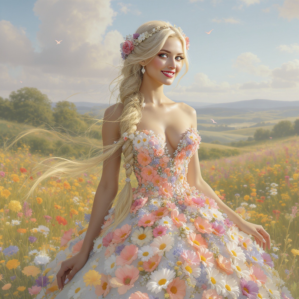 A stunningly detailed and photorealistic digital painting depicts a beautiful blonde woman with a long, flowing braid adorned with delicate wildflowers woven in. She wears an extraordinary dress crafted entirely from an array of vibrant meadow flowers, with intricate petal details and shimmering accents. The dress drapes gracefully around her slender frame, highlighting her elegant waist and softly curved neckline. She stands amidst a mesmerizing landscape of blooming wildflowers, where the sun bathes everything in a soft, warm light. Her radiant smile, combined with the bohemian-inspired ensemble, evokes a sense of elegance and wonder that draws the viewer into a world of natural beauty and imagination.