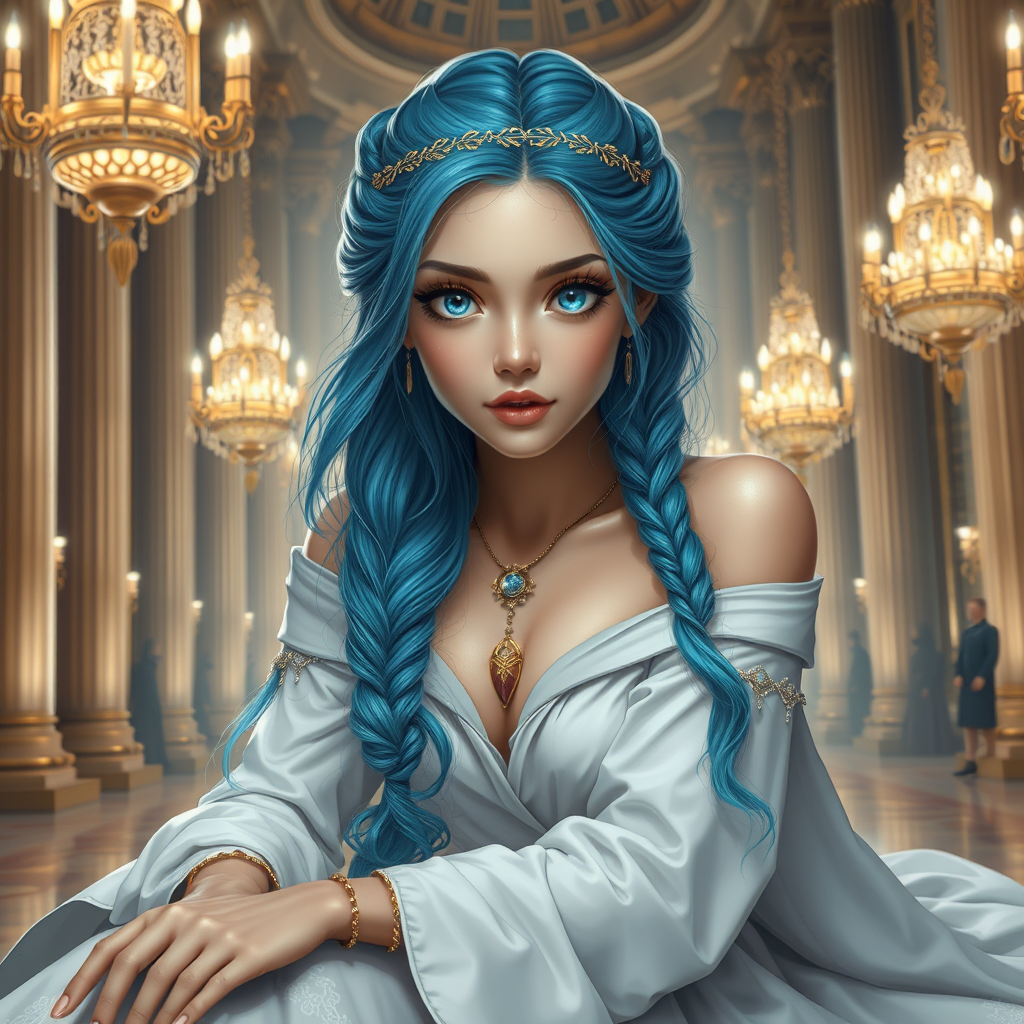 Detailed face and mesmerizing wide eyes, photorealistic hyperrealism, flowing loosely half-tied braid of long cerulean hair, delicate elven tiara circlet, graceful bracelet, shimmering amulet, sparkling azure eyes, elegant small bust, serene expression with closed lips, exquisite off-shoulder white gown with long sleeves, ethereal white cloak, slender 5-fingered hands, pale porcelain-like skin, slender waist, detailed intricate golden leaf circlet, curvy hips, ornate high heels, gracefully reclining on the floor, grand chandeliers illuminating a majestic hall with towering columns, a breathtaking masterpiece illustration in 3D painting, complemented with artistic flair and creativity.