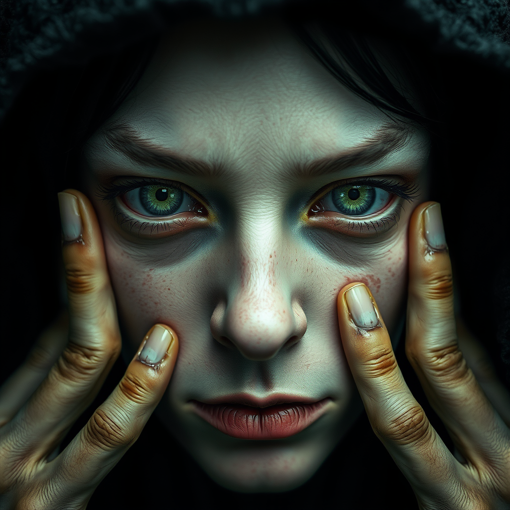Detailed face, enchanting green eyes, post-apocalyptic aura, mysterious occult vibe, Lovecraftian elements, haunted atmosphere, mystical incantation, sharp focus, high definition, ultra-high resolution, vivid HDR, eerie presence, irregular iris and pupils, peculiar gaze, cross-eyed expression, duplicate facial features, additional fingers, altered hands, abstract composition, low resolution aesthetic, subtle textural imperfections, abstract watermark hints, ethereal ambiance, elongated neck, elements in and out of frame, enigmatic character study.