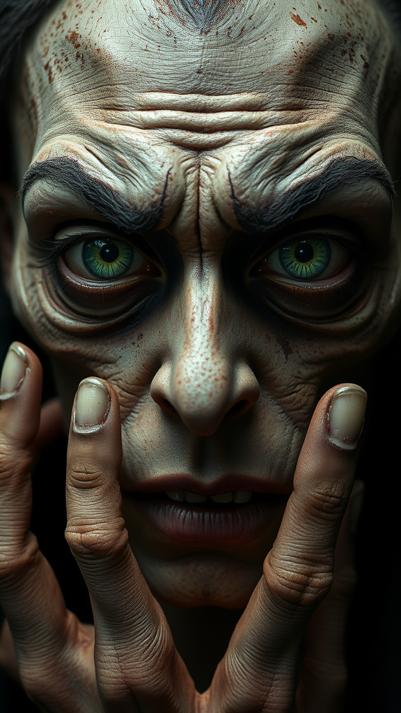 Detailed face, piercing green eyes, post-apocalyptic atmosphere, mysterious and occult themes inspired by Lovecraft, haunted expression, reciting incantations, ultra-high-definition with 16k resolution, HDR features, uniquely deformed iris and pupils, eerie cross-eyed look, duplicated facial features, extra and mutated fingers, subtle low-resolution elements, imaginary watermark and signature, artistic representation with a surreal twist, elongated neck subtly blending into the frame, cropped composition with a dreamlike quality, enhanced details reminiscent of a reference sheet, uncanny and otherworldly aesthetic.