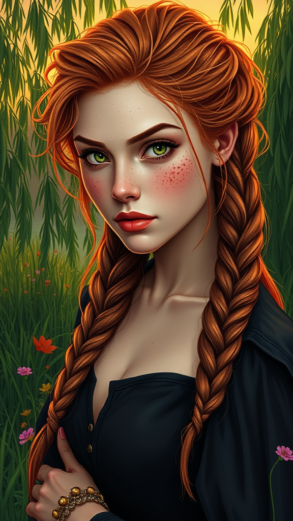 Detailed face, sensual, tousled ginger hair, freckles, prominent features, defined square jaw, intricate long braids, high cheekbones, sharp features, heart-shaped lips, elegant long dark dress, emerald green eyes, hourglass figure, full chest, dynamic golden hour lighting, captivating, vivid landscape, hyper-detailed, surrounded by weeping willows, lush green grass, vibrant flowers, earth-inspired art, stunning, colorful fantasy scene, matte background, detailed painting, intricate and elegant, oil painting style, artstation aesthetic, concept art influence, smooth and sharp focus, illustration style reminiscent of Artgerm, Greg Rutkowski, Alphonse Mucha, and William-Adolphe Bouguereau, reflections captured with octane render for high-quality photo-realism, hyper-realistic and very detailed, zoomed out full-body view of character with freckles, inspired by fantasy themes such as Lord of the Rings bandit, long unkempt hair, UHD, HDR, 8K resolution. A unique portrayal maintaining artistic elegance while eliminating imperfections such as disfigurements or visual distortions for a more cohesive and polished presentation.