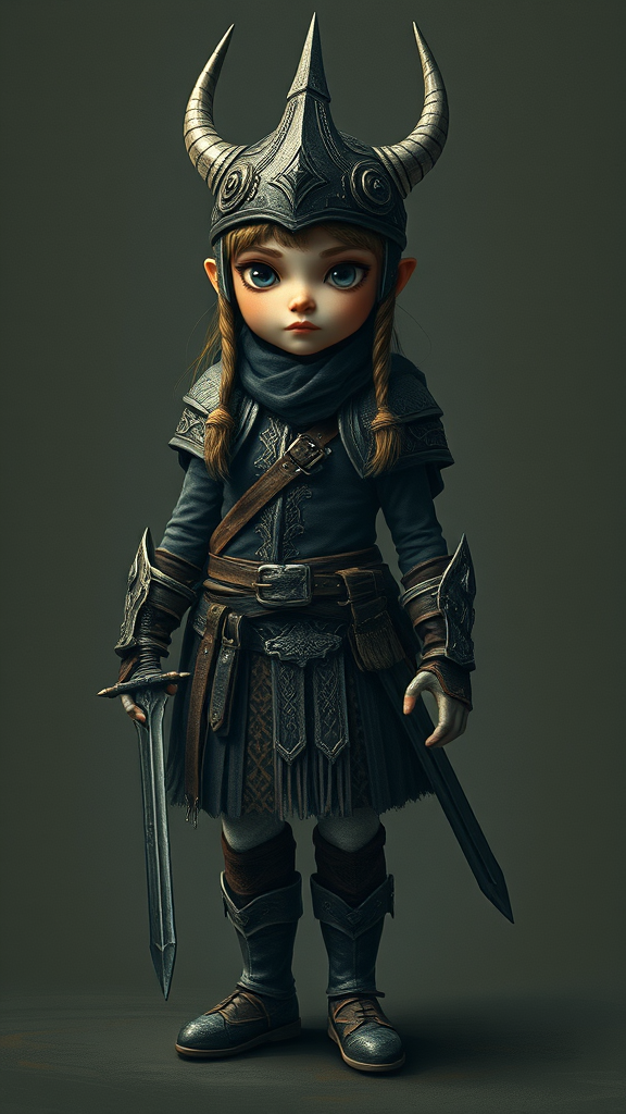 Detailed full body concept art illustration, dark and soft focus, depicting a little Viking warrior girl in ornate attire; she is a fascinating blend of biomutant features in a dystopian setting. The artwork, reminiscent of a plague-style oil painting on canvas, captures micro details and utilizes an octane render for clarity at 4K resolution. The character is portrayed in a slightly abstract and animated fashion, reminiscent of a toy figure but maintaining elegance. Her clothing and armor reflect intricate Viking patterns, while subtle fantasy elements hint at mutations. The scene is framed, bringing a sense of realism that contrasts with cartoonish undertones. Despite the softness, the image retains focus on the warrior's stern expression and determined stance. The color palette is uniquely subdued with unexpected highlights, giving a sense of adventure and mystery. The deformed, elongated shadow stretches behind her, creating a haunting yet fascinating effect. There's an intentional surreal element with elongated limbs and exaggerated proportions that add to her otherworldly presence, while artistically playing with the concept of strength in vulnerability.