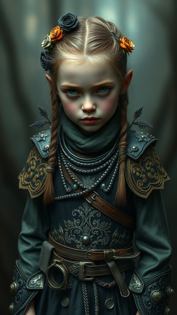 detailed full body concept art illustration, dark mysterious focus, plague style oil painting on canvas of a little viking warrior girl in ornate clothing, biomutant, dystopian, micro detail, octane render, 4K, dreamlike, abstract touches, surreal elements, artistic render, unique proportions, whimsical colors, blurred edges, ethereal atmosphere, imaginative interpretation, artistic hands, surreal anatomy, creative body form, fantastical elements, intriguing proportions, captivating imperfections, mysterious expressions, imaginative distortions, fantastical scenery, otherworldly details, artistic fluidity, enigmatic charm, visionary depiction.