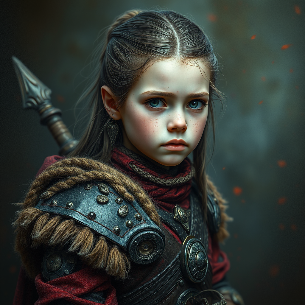 detailed full body concept art illustration, dark soft focus, plague style oil painting on canvas of a little viking warrior girl in full intricate clothing, biomutant, dystopian, micro detail, octane render, 4K, surreal, abstract, unique forms, imaginative, ethereal glow, artistic blur, whimsical, mythical atmosphere, captivating colors, mysterious aura, dreamlike haze, expressive, artistic expression, fluid shapes, intriguing composition, enchanting, visual storytelling, fantastical elements, evocative and thought-provoking, rich textures, dynamic lighting, alluring details, creative interpretation, imaginative design, harmonious blend.