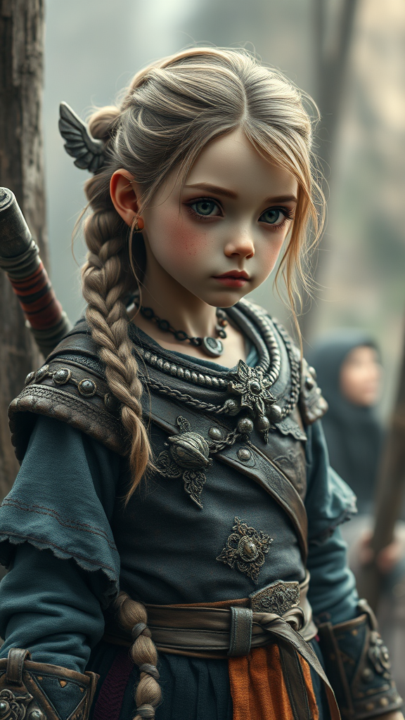 Detailed full body concept art illustration, soft dark focus, depicting a young viking warrior girl adorned in intricate clothing with elements of biomutant features, set in a dystopian world. The style resembles a plague-era oil painting on canvas, showcasing micro details with a high-resolution, 4K octane render. The scene has a slightly abstract and blurry effect, with animated, toy-like qualities. The composition includes a framed setting with artistic interpretations that suggest elongated and imaginative forms, intriguing proportions, and a dream-like haze. The warrior girl may have unusual features such as elongated limbs or fingers, symbolizing mutation, with an emphasis on a whimsical and surreal aesthetic. The colors are vivid yet maintain a coherent palette, with a touch of strange harmony. This imaginative depiction embraces the chaotic beauty of imperfection while remaining artistically appealing and evocative of an otherworldly narrative.