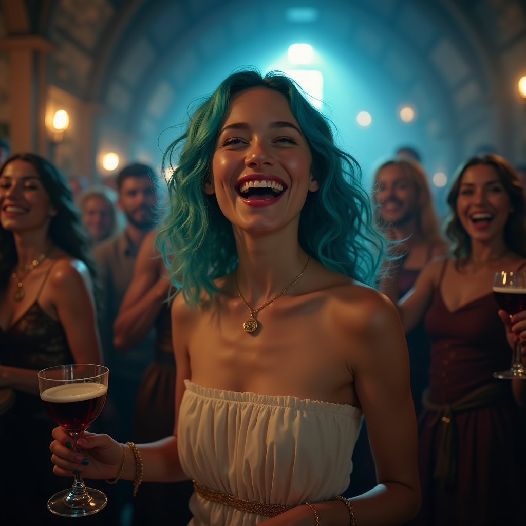 View this AI-generated image featuring a highly detailed and realistic full body image from a fantasy movie scene featuring a young girl with vibrant turquoise hair joyously laughing while holding a goblet of wine she wears an elegant white strapless tube top her lively expression contrasting with t