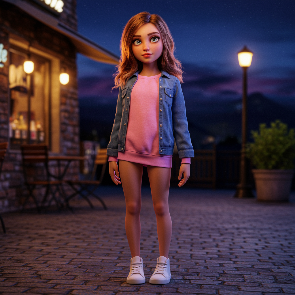 A beautifully detailed girl is depicted in a full-body pose, standing outdoors at night, with a captivating sky and a charming café as her backdrop. She gazes directly at the viewer with mesmerizing, intricately detailed eyes and lips, illuminated by professional, cinematic lighting. She wears a pink sweatshirt paired with a jacket and white sneakers, exuding casual elegance. The scene employs advanced rendering techniques like photon mapping and radiosity to enhance the realistic lighting and detail. The focus is on high-quality detailing without imperfections, ensuring flawless hands and feet, no extra or missing limbs, and a seamless presentation with no watermarks or blurriness.