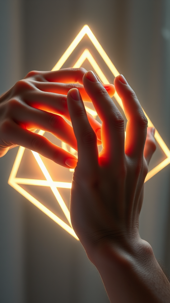 Detailed hands delicately interacting with a glowing geometric shape, each finger casting soft shadows under ethereal light in stunning high-resolution.