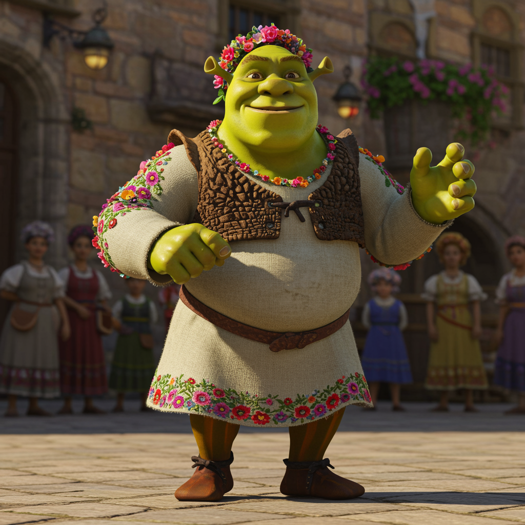 A highly detailed and photo-realistic image capturing Shrek adorned with intricate and richly decorated floral ornaments, wearing a beautifully embroidered folk dress. Shrek is captured in a moment of fun and joy, dancing gracefully under ambient sun lighting. The imagery conveys a sense of whimsy and celebration, with UHD and 8k quality highlighting every detail. Despite this, there are intentional imperfections: the image exhibits slight text errors and JPEG artifacts, hinting at a sense of digital age nostalgia. Shrek's joyful expression and movements are central, although there are elements of creative distortion, giving the scene a surreal touch with slightly exaggerated features and proportions, such as a whimsical length of neck and playful inclusion of extra fingers. The overall composition remains visually engaging and charmingly unique.