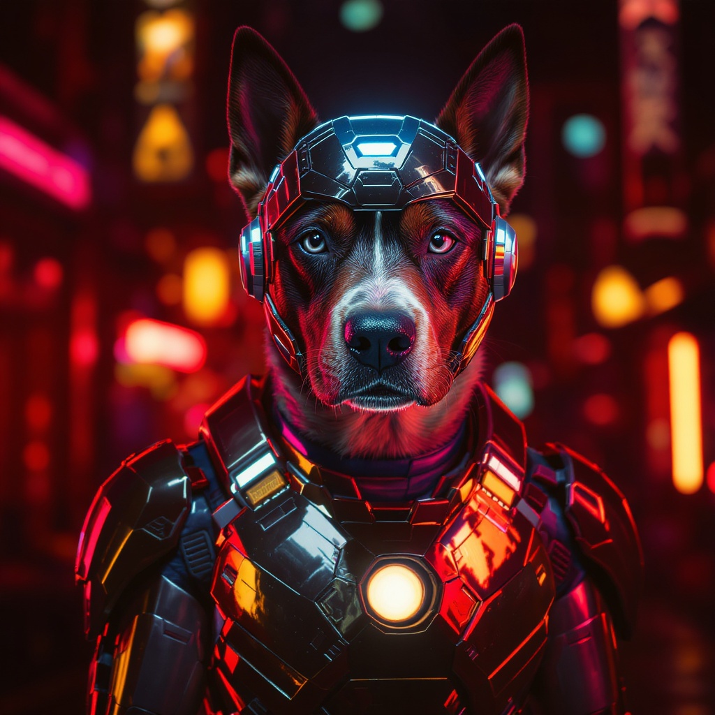A highly detailed image of a dog portrayed in an alert pose, with a cyberpunk style featuring a bionic helmet and Iron Man-inspired armor. The armor shines with a combination of golden hues and chrome plating. The backdrop is illuminated with striking red and yellow lights for dramatic contrast. Rendered in ultra-realistic 8k quality, the portrait captures the essence of the dog with remarkable detail. The focus remains sharply on the dog, ensuring clarity and precision without any distortions or artifacts. The composition is centered, with no elements cut off or out of frame, presenting a realistic and visually captivating depiction.