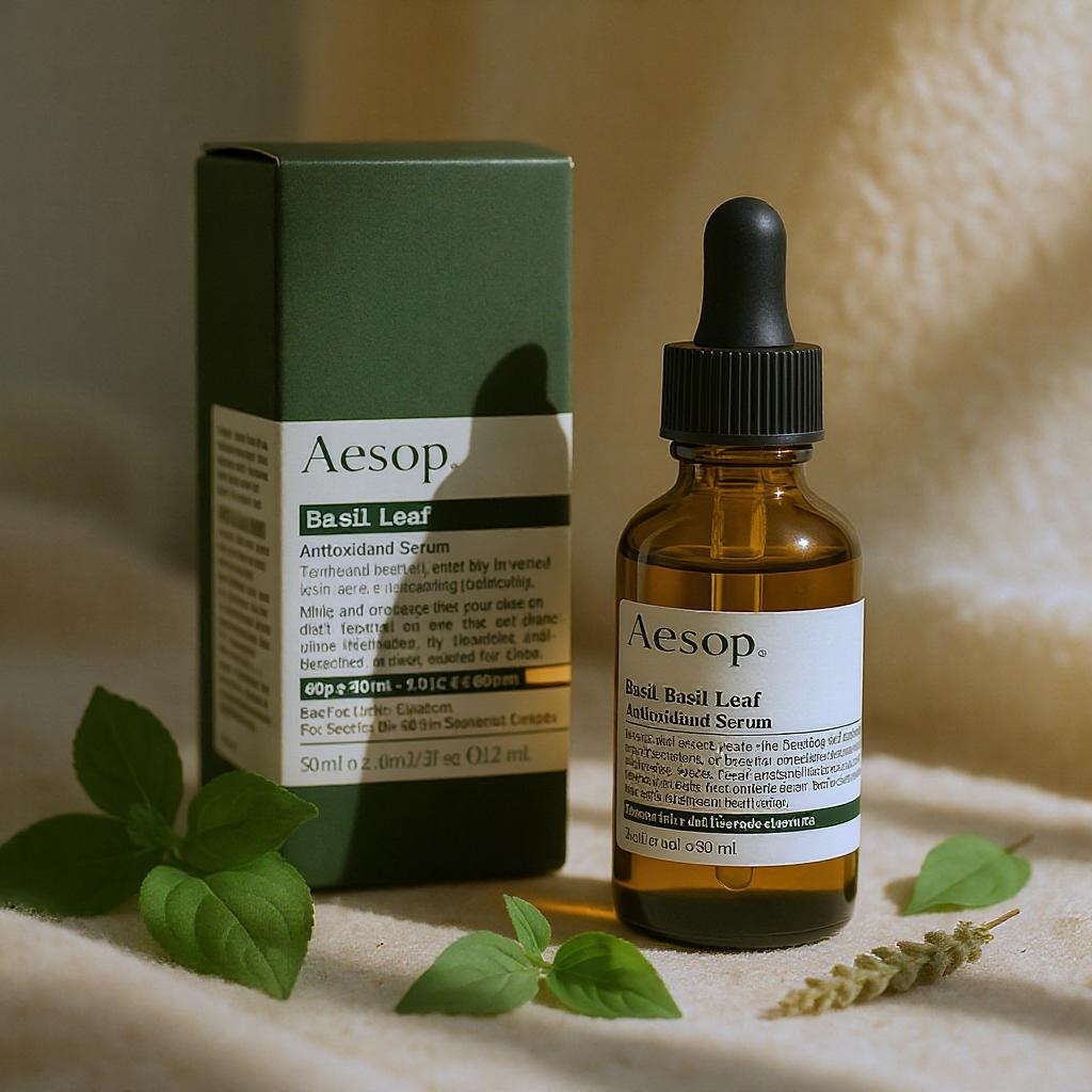 Detailed image of Aesop's Basil Leaf Antioxidant Serum captured with a Canon EOS R5, highlighting the serum's sleek and sophisticated packaging alongside its natural allure, set in a cozy, gentle glow ambiance.