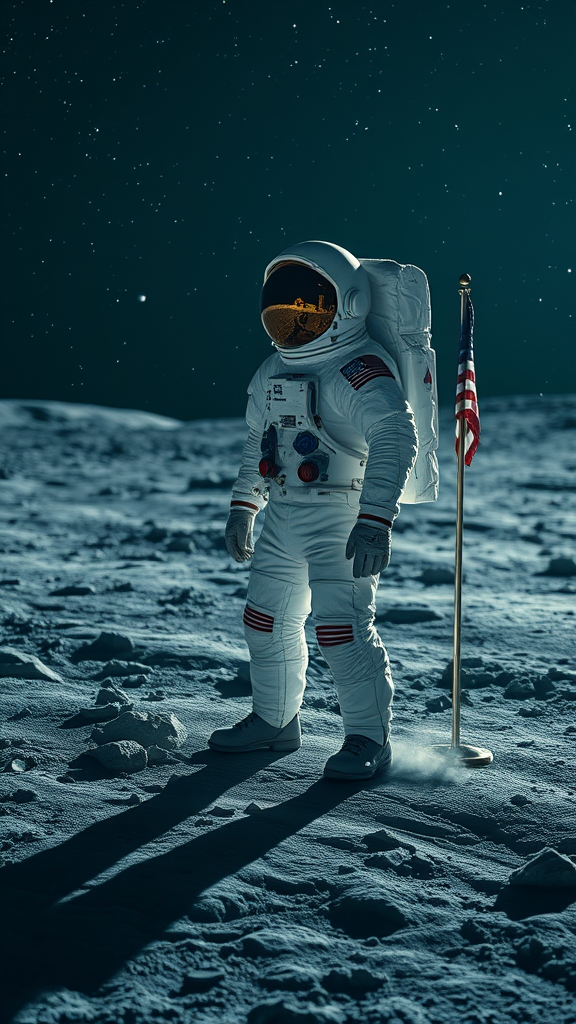 Detailed image of an astronaut standing on the moon’s surface under a star-filled sky, featuring a cold color palette with shades of blue and gray. The lunar landscape is textured with craters and rocks, casting long, faint shadows. The astronaut's reflective visor captures a glimpse of Earth in the distance. Subtle details like dust floating gently and the flag planted firmly nearby add depth, while muted colors and sharp focus convey the serene yet desolate environment.