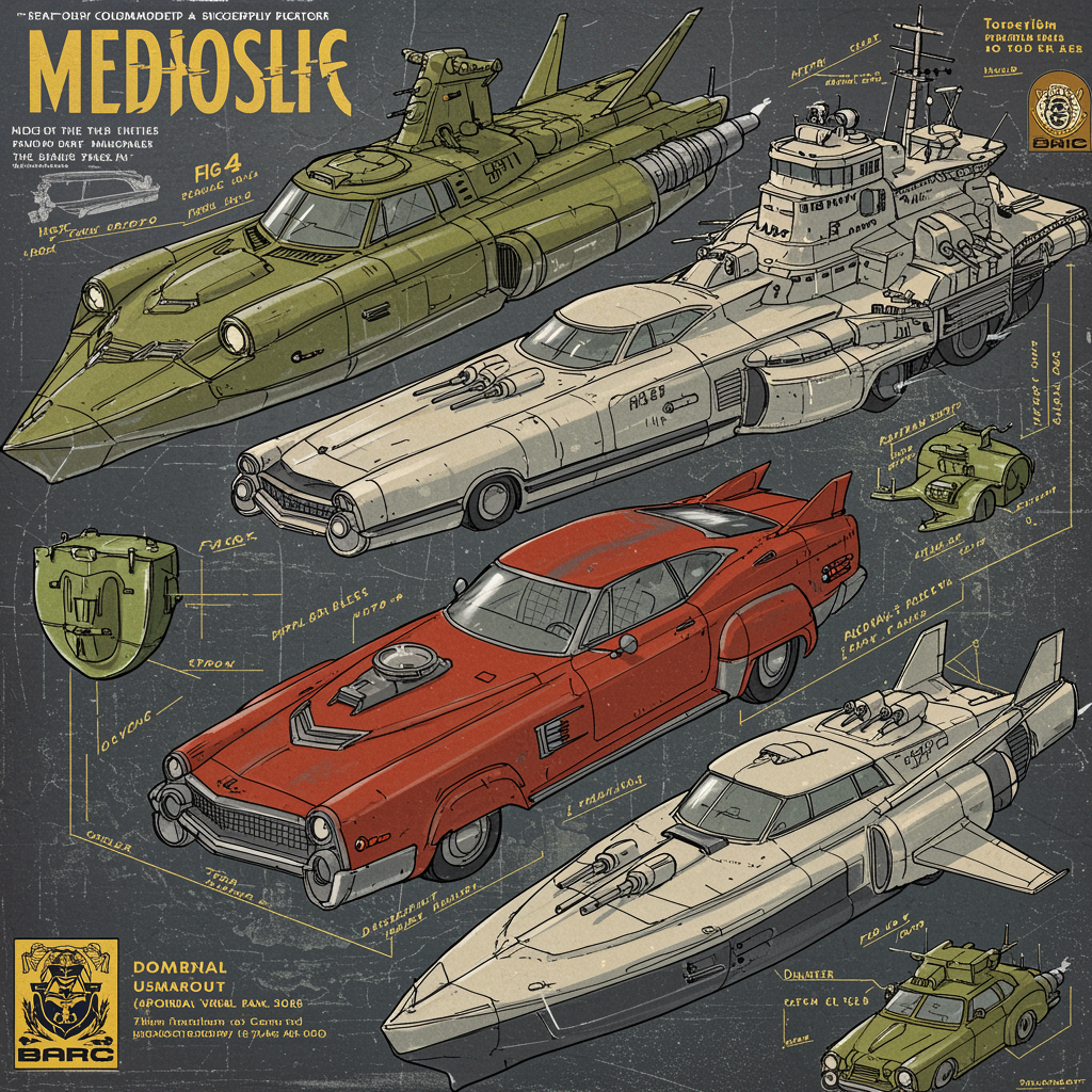 An intricate and highly detailed infographic showcasing retrofuturistic cars inspired by vintage Popular Mechanics magazine covers, blending digital art with concept painting. This award-worthy poster encapsulates maximum detail, utilizing HDR effects to highlight every nuance. Designed as a scientific illustration, this concept render features precise architectural plans and technical illustrations, akin to a patent diagram. The composition boasts symmetrical layouts reminiscent of battleship designs, creating a harmonious blend of nostalgia and futuristic innovation.