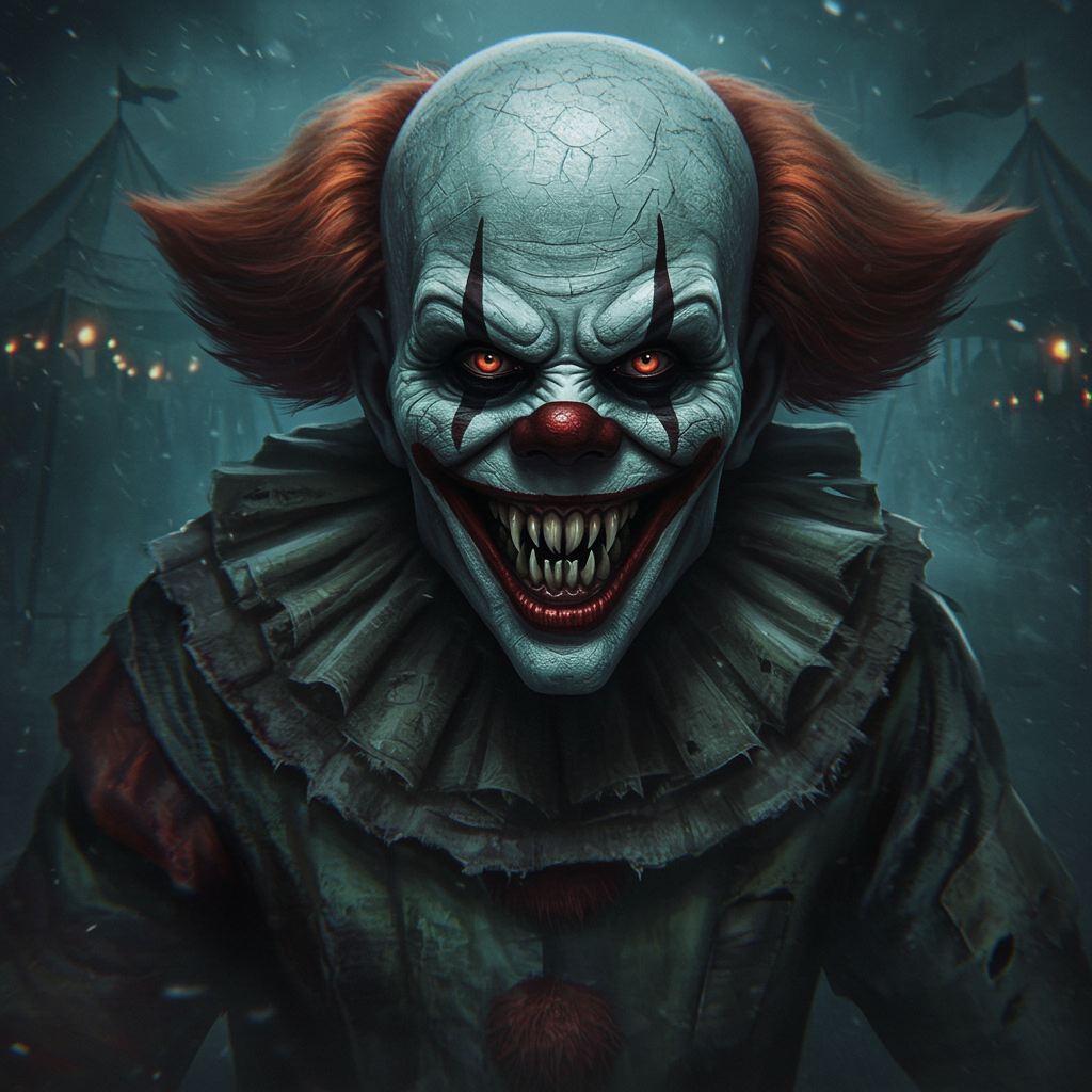 View this AI-generated image featuring a hyper detailed masterpiece photograph captures a sinister clown with an infernal aura its unsettling grin revealing sharply pointed teeth that glint under dim eerie lighting the clown s eyes filled with a malevolent gleam seem to pierce through the lens exudi