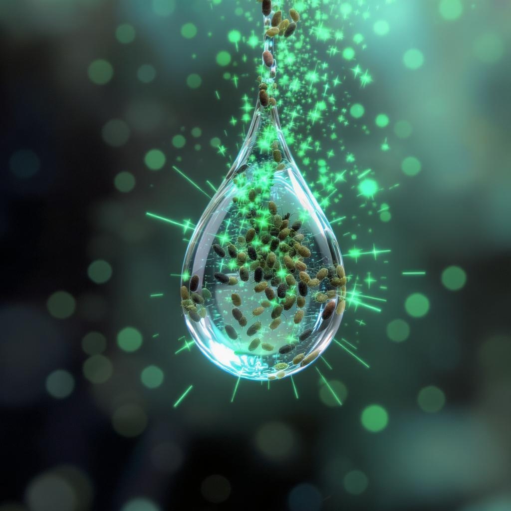 View this AI-generated image featuring a highly detailed microscopic photograph captures mites submerged in a glistening drop of water surrounded by a cascade of luminescent green sparks cascading through a softly transitioning background the sparks vibrant and bright emit an ethereal green glow enh