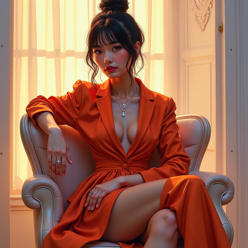 a highly detailed and captivating painting of a fashionable woman seated elegantly on a chair, drawing inspiration from the styles of conrad roset, greg rutkowski, and makoto shinkai, featuring dreamy lighting and intricate textures, with a picturesque, softly glowing background that enhances her vibrant attire and expressive posture, creating a scene that feels both modern and timeless, capturing the essence of beauty and style, trending on artstation aspect ratio 16:9