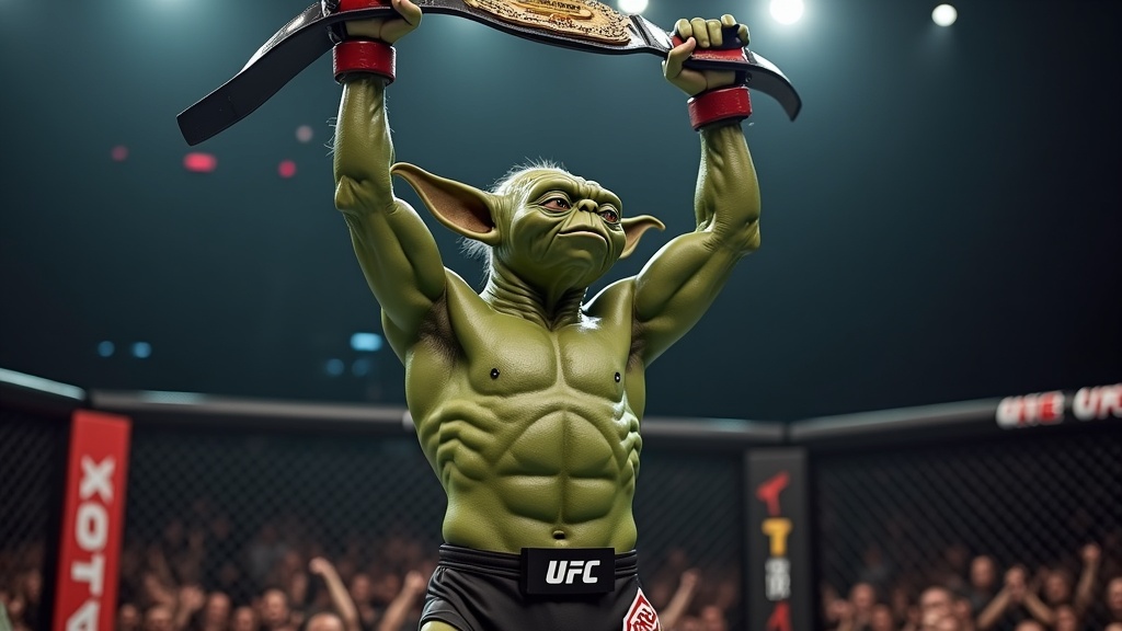 A highly detailed, photo-realistic representation of Yoda as a triumphant UFC champion standing victorious in the octagon, wearing UFC gloves and shorts. His demeanor is fierce yet wise, with battle-worn but focused eyes. He displays a muscular and agile physique, showcasing years of disciplined training. Sweat glistens on his green skin under the bright arena lights. The energy of the cheering crowd is palpable as Yoda raises a championship belt above his head, a look of serene determination on his face.