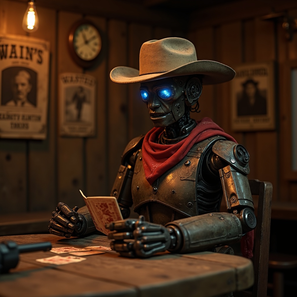 A high-resolution, detailed portrait capturing a cybernetic cowboy robot with intricate metal features sitting at an aged wooden poker table in a classic western saloon. The setting is alive with the warm, nostalgic hues of the old west, illuminated by a flickering oil lamp casting playful shadows across the scene. The robot, adorned in a weathered cowboy hat tilted slightly forward, displays a focused expression as it holds a hand of playing cards. Its eyes, glowing faintly with LED lights, observe its human opponents with mechanical precision. Around its neck, a dusty red bandana complements its sleek, metallic exoskeleton. On the table, a pair of polished revolvers rest within easy reach, speaking to a time of frontier justice. The backdrop showcases wooden walls adorned with vintage wanted posters and sepia-toned photographs. Captured with the Fujifilm XT3, the image is in 8k UHD, offering an astoundingly crisp view with a DSLR quality finish, seamlessly merging the essence of the vintage western charm with futuristic elements.