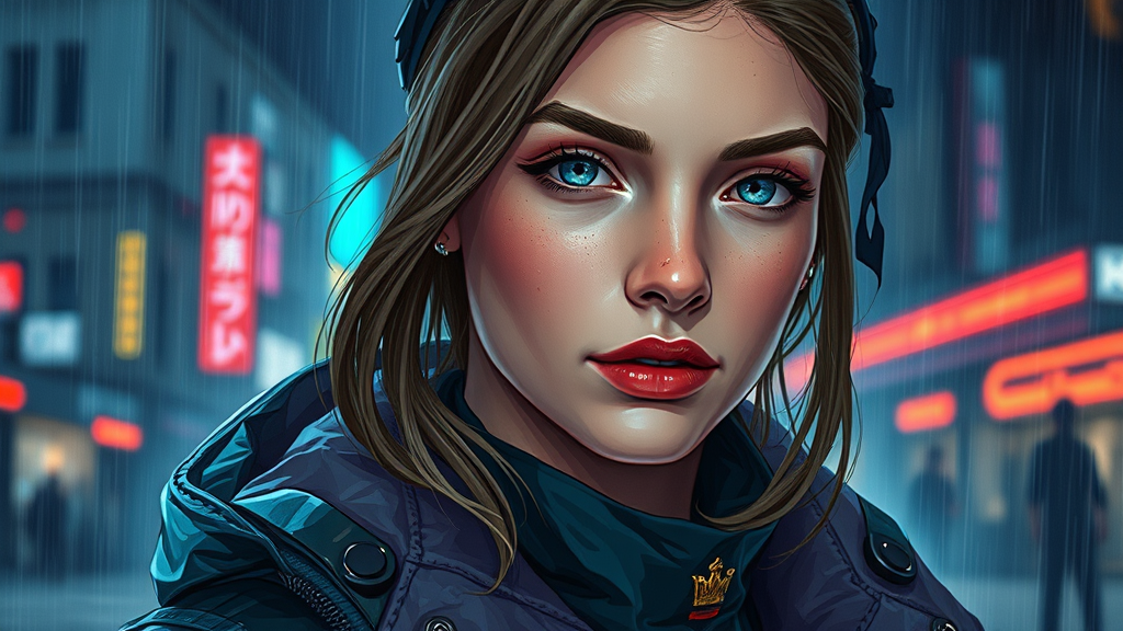 Detailed portrait of a European pretty young girl in a storm, wearing a rain movie jacket and coat, featuring futuristic sci-fi fashion blended with royal attire. Influenced by the styles of Ismail Inceoglu, Dragan Bibin, Hans Thoma, Greg Rutkowski, Alexandros Pyromallis, Nekro, and Rene Magritte. The illustration showcases a perfect face with sharp features and fine details, including a sharp chin. The aesthetic integrates cyberpunk elements, neotokyo vibes, and synthwave influences, capturing a futuristic atmosphere with low-emission neon lights reminiscent of a Blade Runner movie scene. The setting is cinematic with a touch of fantasy, emphasizing unique and avant-garde fashion, highlighting the character's elegance and poise, all while maintaining a vivid and captivating visual style.