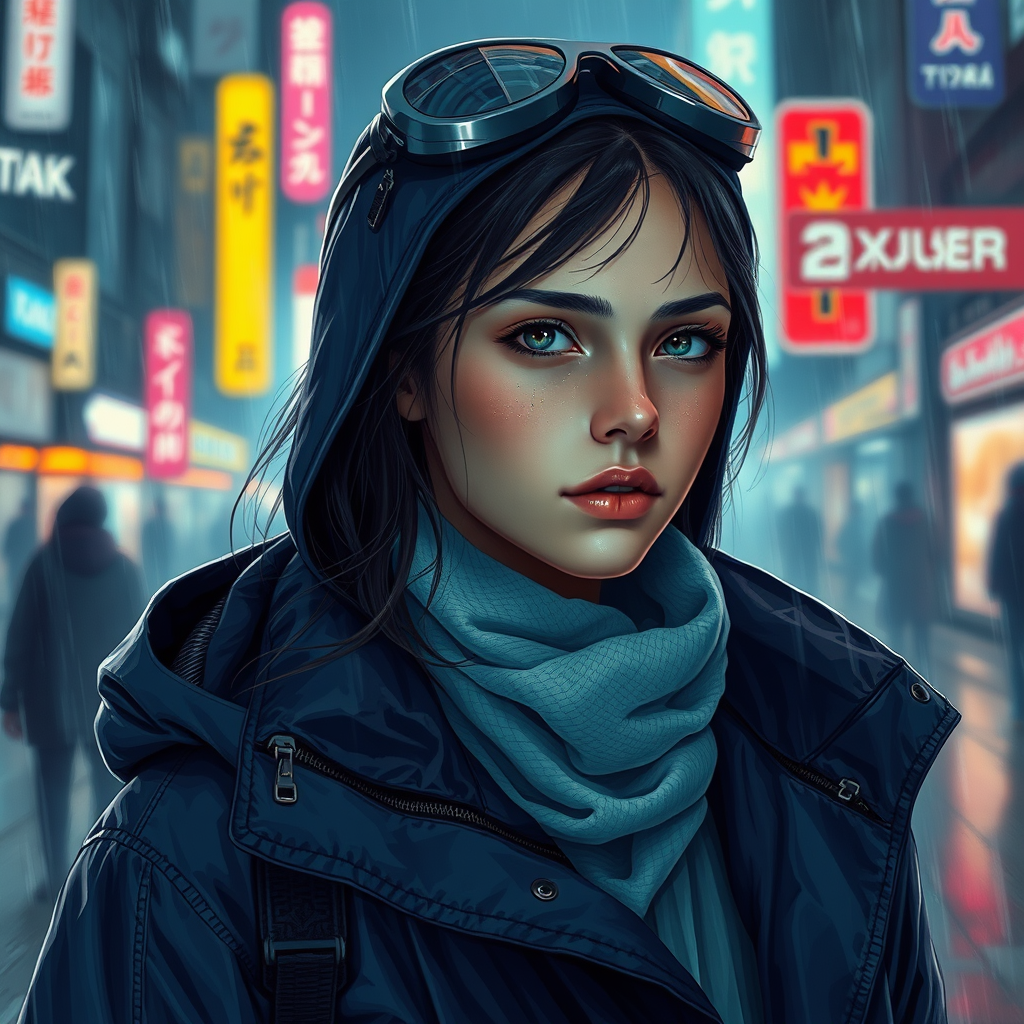 Detailed portrait of a European pretty young girl in a storm, wearing a rain movie jacket and coat, with a futuristic sci-fi fashion sense and royal attire reminiscent of the styles of Ismail Inceoglu, Dragan Bibin, Hans Thoma, Greg Rutkowski, Alexandros Pyromallis, Nekro, and Rene Magritte. Her perfect face is defined by a sharp chin and fine details, combining realistic shading with a fine, pretty face. The setting is a cyberpunk neotokyo environment inspired by synthwave aesthetics, characterized by low-emission neon lights akin to a Bladerunner movie scene. The portrait maintains high quality in its depiction, focusing on perfect proportions and seamless details. The futuristic attire features innovative and sophisticated designs, blending seamlessly into the moody, technologically advanced backdrop of the scene.