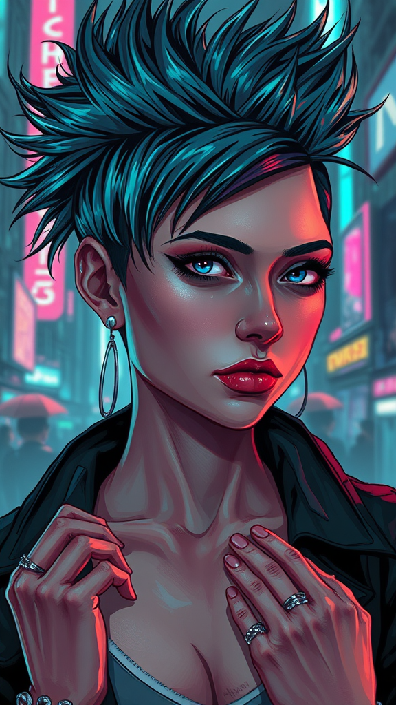 Detailed portrait of a punk girl with a futuristic edge, featuring standing hair with a sheen that reflects a holographic, sci-fi fashion. The overall style is inspired by cyberpunk aesthetics and synthwave, reminiscent of a Blade Runner movie scene. The artwork highlights influences from artists like Ismail Inceoglu, Dragan Bibin, Hans Thoma, Greg Rutkowski, Alexandros Pyromallis, Nekro, and Rene Magritte. The girl has a perfect, finely detailed face with realistic shading, characterized by a sharp chin and expressive features. The background subtly hints at a futuristic cityscape, with neon lights and digital elements. Care is taken to render the anatomy accurately, with correct proportions and well-drawn hands. The portrait exudes a sense of mystery and allure, focusing on the vivid, dynamic elements of the character and her setting.