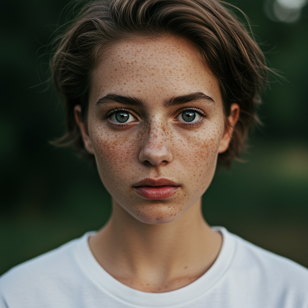 A highly detailed and realistic portrait of a striking woman with a scattering of freckles, round expressive eyes, and short, slightly tousled hair. Captured outdoors, she wears a simple white T-shirt, looking directly at the camera. Her lips are slightly chapped, and the soft, natural lighting enhances her features. The portrait, rich in photorealism, employs dramatic lighting to create a magical and intimate composition, shot with an ultra-wide aperture of f1.4, accentuating her skin's natural texture including subtle moles. The focus is on the warmth and authenticity conveyed through her gaze, exuding a sense of sincerity and understated beauty.