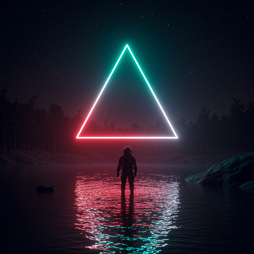A highly detailed, raw photograph captures an astronaut standing at the edge of a tranquil lake, illuminated by the crisp light of a Fujifilm XT3 camera. The scene is a stunning example of 8k UHD resolution and HDR technology, with ray tracing enhancing the vibrant reflections on the water's surface. At this serene yet surreal night setting, a colossal, glowing neon triangle replaces the rectangle, casting mesmerizing geometric patterns across the astronaut's suit. The neon glow dances across the gentle ripples of the lake, creating an ethereal atmosphere that blends otherworldly exploration with the silent beauty of nature.