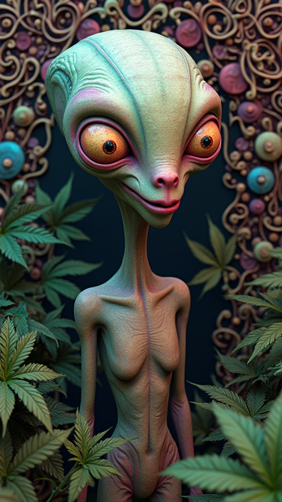 View this AI-generated image featuring a highly detailed 3d rendering of the alien character roger smith from american dad set against an intricate psychedelic background featuring intertwining voodoo motifs and lush maryjane leaves the scene is infused with vibrant colors that evoke an otherworldly
