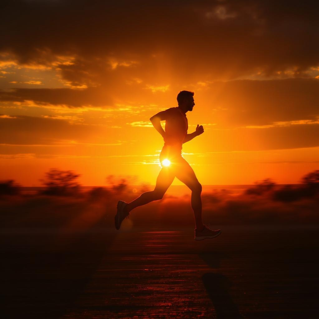 detailed runner silhouetted against a radiant sunrise, striking high-contrast lighting with intense fiery orange and vibrant yellow highlights, dynamic textured shadows, cinematic motion blur capturing motion, professional athletic brand aesthetic, perfectly centered