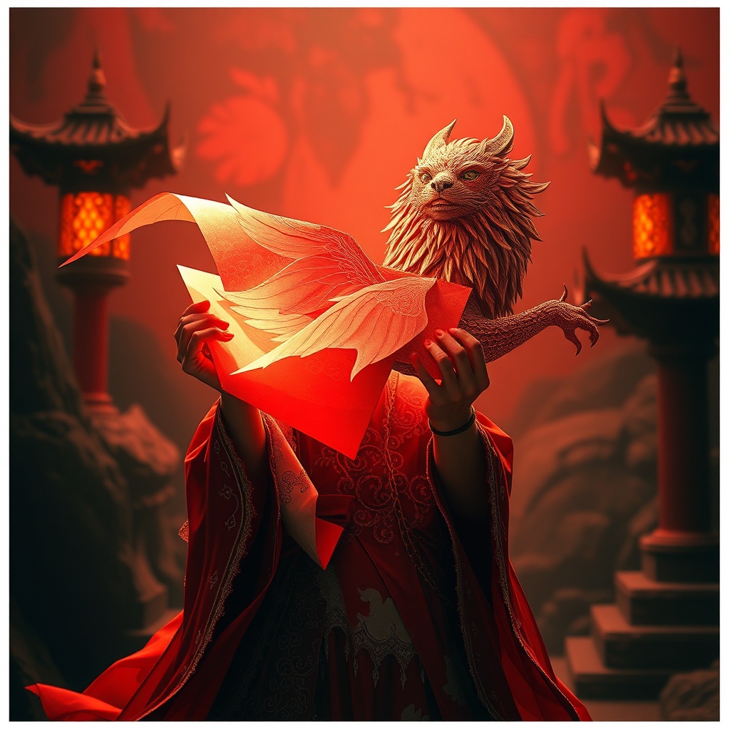 A highly detailed scene featuring an anime character gracefully holding a piece of paper transformed into a striking animal, set against a backdrop inspired by the striking artistry of Max Rive, with intricate and elaborate costumes reminiscent of Luke Fildes. The composition is infused with rich red and brown tones, capturing a realist essence that pays homage to Tarō Okamoto's unique style. The lighting and atmosphere resemble the cinematic quality of Cinestill 50D film, emphasizing vivid and lifelike detail. This composition blends elements of realism and imaginative artistry, creating a visually captivating and immersive experience.