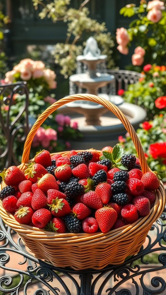 A meticulously detailed Victorian basket overflowing with an array of strawberries, blackberries, and raspberries, set upon an ornate wrought iron garden table. The vibrant hues of the berries are accentuated by the dappled sunlight filtering through the lush foliage of a well-tended Victorian garden, complete with blooming roses and a charming fountain in the background. The scene is rich in color and texture, capturing the essence of a serene summer afternoon.