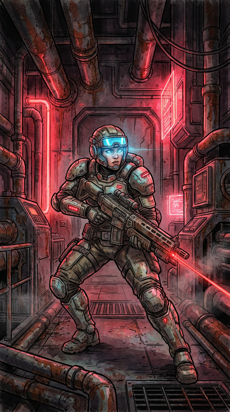 A determined female soldier in futuristic armor holds a rifle with a red laser sight, poised in a dark, grimy industrial sci-fi setting. Neon red lighting and glowing energy effects create a tense, moody atmosphere, rendered in a comic book and watercolor blend.