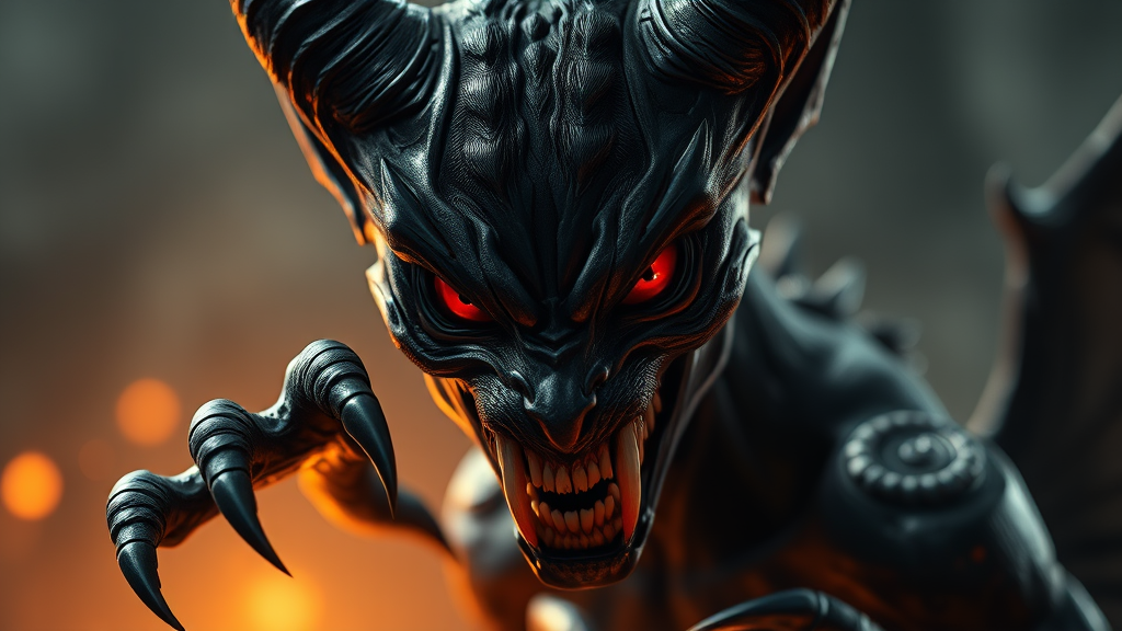 devil predator lilith, hyper realistic 3D ultra detail rich art style cinematic 4k 3840x2160 resolution, micro texture details, gritty dark atmosphere, intense eye contact, sharp razor-sharp talons, luscious black fur, piercing red-orange eyes, dramatic background settings, emphasizing light and shadow effects, subtle dynamic lighting, detailed facial features, preferably with noticeable wrinkles and sharp cheekbones, depth of field blurring, warm dark color palette, making the overall scene feel moody and intense, slightly altering the shape of the predator's eyes to give them a slimmer, more elongated appearance