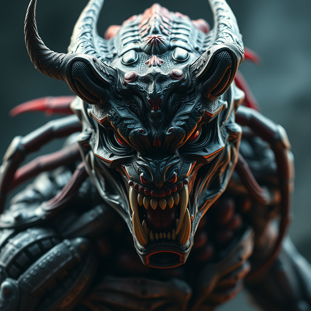 Devilish predator, hyper-realistic rendering, ultra-detailed and rich in texture, vibrant style, 3D lifelike quality, 4k resolution, intricate micro details, atmosphere of intensity and powerful presence.