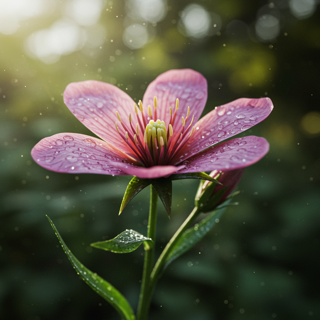 Dew-clad petals glisten as morning sunbeams gently caress, revealing nature's radiant allure. Captured in a dynamic pose and perfectly centered, the composition is a key visual of intricate detail and breathtaking beauty. The precise lineart and vibrant tones create a comprehensive cinematic experience reminiscent of Carne Griffiths, Conrad Roset, and Anna Dittmann. The scene is softly illuminated by dappled sunlight, exuding a sense of tranquility and wonder, unmarred by errors or distortions.