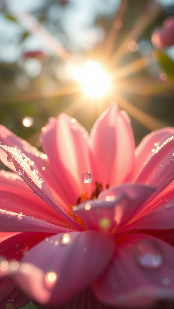 Dew drops delicately rest on petals as the morning sun casts gentle beams, revealing nature's radiant beauty. A dynamic pose is centered, capturing intricate details and breathtaking allure with precise linework and vibrant hues. Inspired by the styles of Carne Griffiths, Conrad Roset, and Anna Dittmann, the scene exudes a comprehensive cinematic quality. Dappled sunlight enhances the visual without distractions like text, errors, or low resolution, ensuring harmony without flaws or unwanted elements.