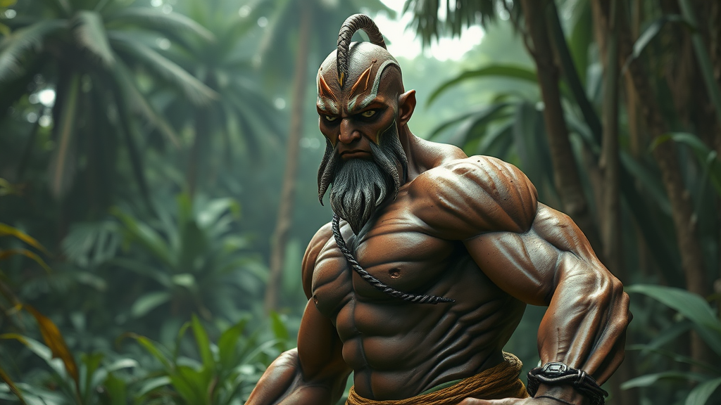 Dhalsim from Street Fighter, captured in an epic realistic style within a lush jungle environment, resembling movie photography. The scene is highly detailed and ultra-realistic akin to real photography, featuring sophisticated high-end visual effects at the highest resolution. Created by an award-winning studio, the imagery includes professional color grading with soft shadows, minimal contrast, and a clean, sharp focus, resembling high-definition film quality in 8k resolution. The atmosphere feels immersive and vivid with natural elements harmonizing with Dhalsim's iconic presence. Aspect ratio is cinematic widescreen.