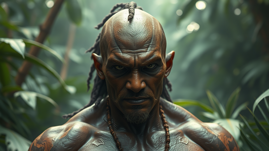 Dhalsim from Street Fighter emerges in an epic realism style amidst a lush jungle atmosphere, captured with movie photography. The scene is highly detailed and ultra-realistic, as if captured in real photography, showcasing high-end visual effects at maximum resolution. An award-winning studio oversees the shoot, providing professional color grading with soft shadows and minimal contrast. The image is clean, sharp, and in perfect focus, resembling film shot in 8K quality. The atmosphere is humid and vibrant, with the jungle's dense greenery surrounding Dhalsim, adding depth to the serene yet intense character. His skin glistens with subtle sweat, capturing the tropical climate's essence, while the play of light and shadows across his form highlights his calm yet powerful presence in cinematic 16:9 aspect ratio.