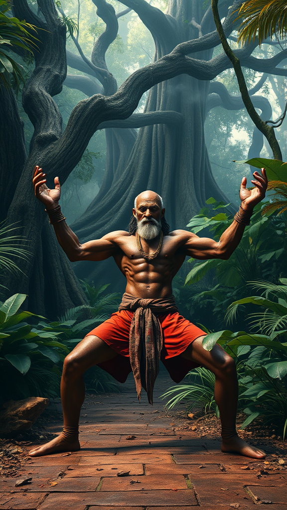 Dhalsim, the iconic character from Street Fighter, depicted in an epic realism style amidst a lush jungle atmosphere, captured with movie-quality photography and high-end visual effects. The scene is rendered in ultra-realistic detail and maximum resolution, akin to award-winning studio production. The image features professional color grading, sophisticated shadows, minimal contrast, and clean, sharp focus in 8k photography. Dhalsim is portrayed with an air of mysticism, his limbs elongated as if in mid-yoga pose, surrounded by vibrant foliage and ancient trees, with hints of mist in the air, creating a serene yet powerful presence. The cinematic composition captures the essence of tranquility and strength, exuding an aura of mystical wisdom in a vibrant natural setting.